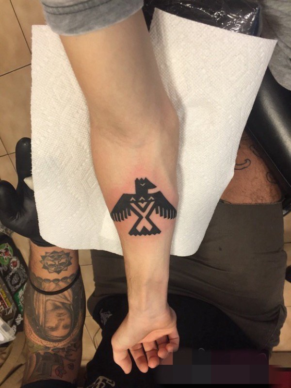 手臂上黑白灰风格抽象线条几何元素老鹰纹身图案