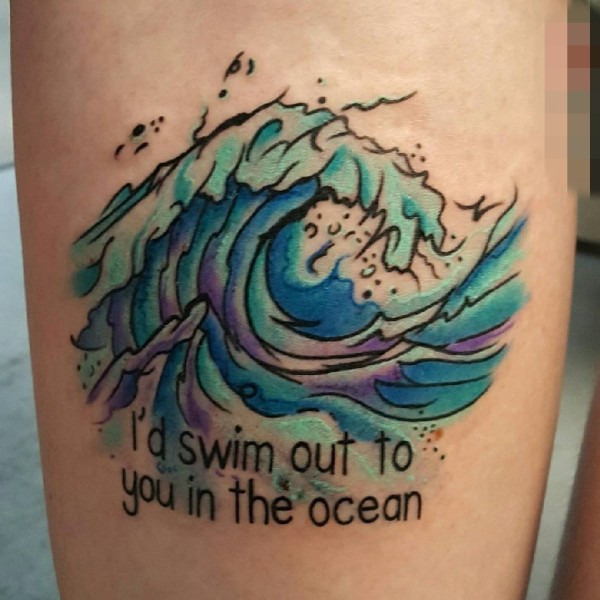 小腿彩绘天蓝色抽象线条水浪花有意义的英文短句纹身图案