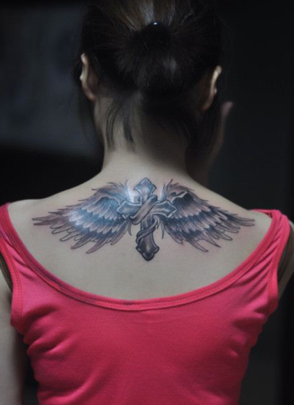 女生背部漂亮时尚的十字架翅膀纹身图案