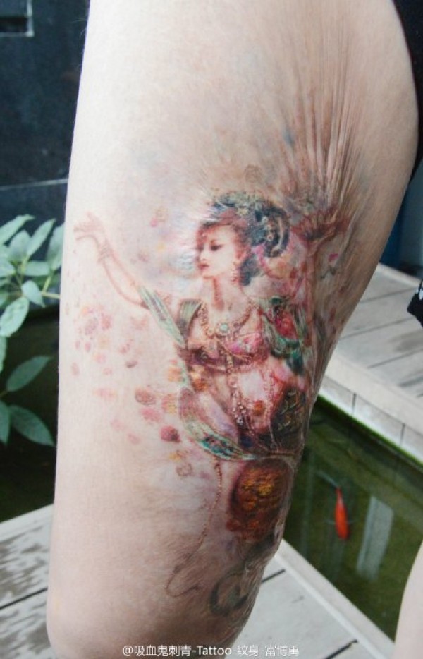 腿部精美的彩绘仙女下凡纹身图案
