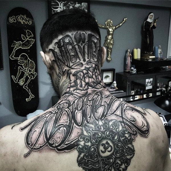 头部和颈部花体字母黑灰个性纹身图案