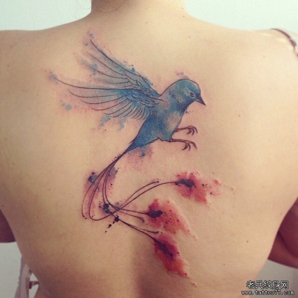 背部泼墨小清新鸟花卉纹身图案