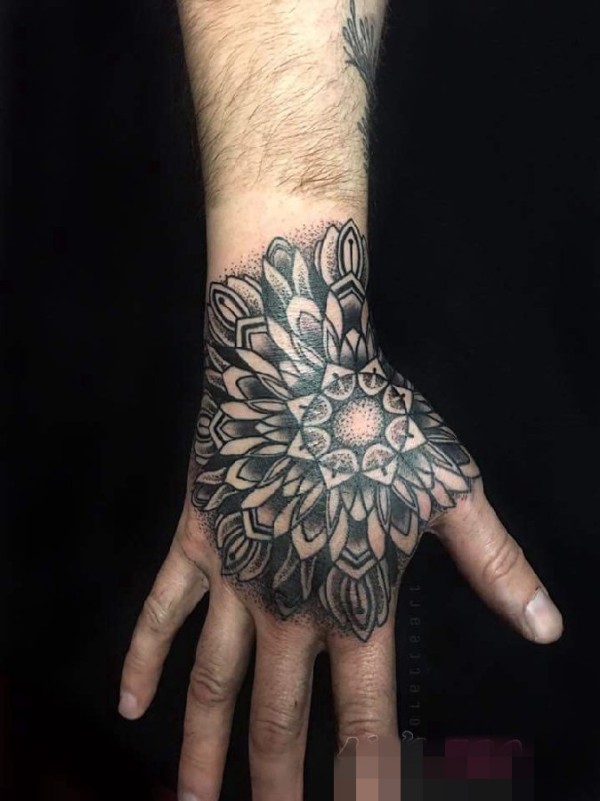手背黑白灰风格点刺技巧几何元素植物素材花朵纹身图片