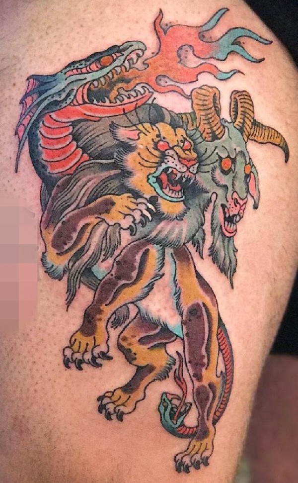 大腿上彩色传统羊头老虎和火龙纹身动物图片