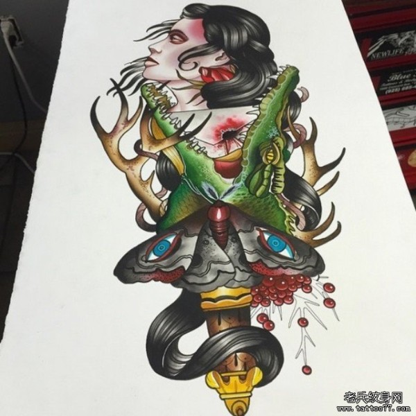 欧美彩色女郎鳄鱼鹿角纹身图案手稿