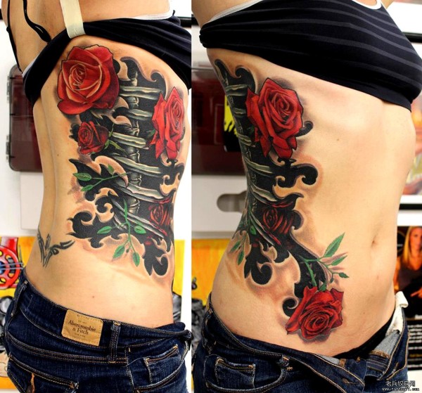 侧腰3D骨架玫瑰彩色欧美纹身图案