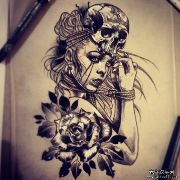 欧美黑灰school女郎骷髅玫瑰纹身图案手稿