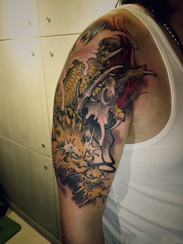 金龙腾飞,大臂黄金神龙彩绘纹身