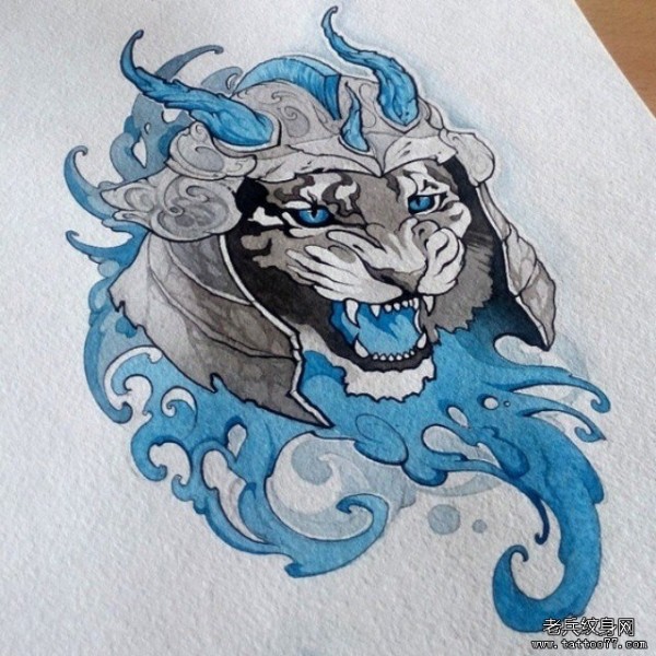 欧美老虎武士头盔彩色泼墨纹身图案手稿