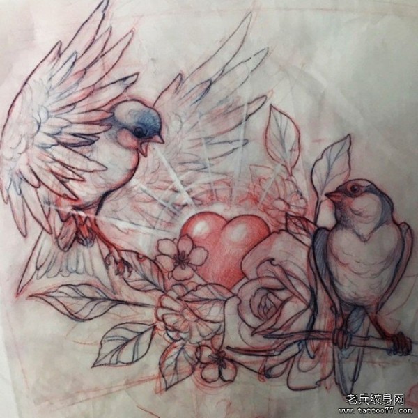欧美小鸟巢心形玫瑰纹身图案手稿