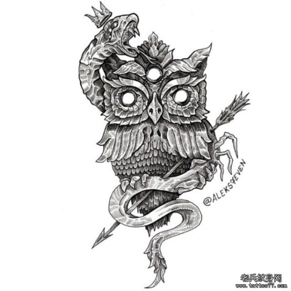 欧美猫头鹰蛇黑灰纹身图案手稿