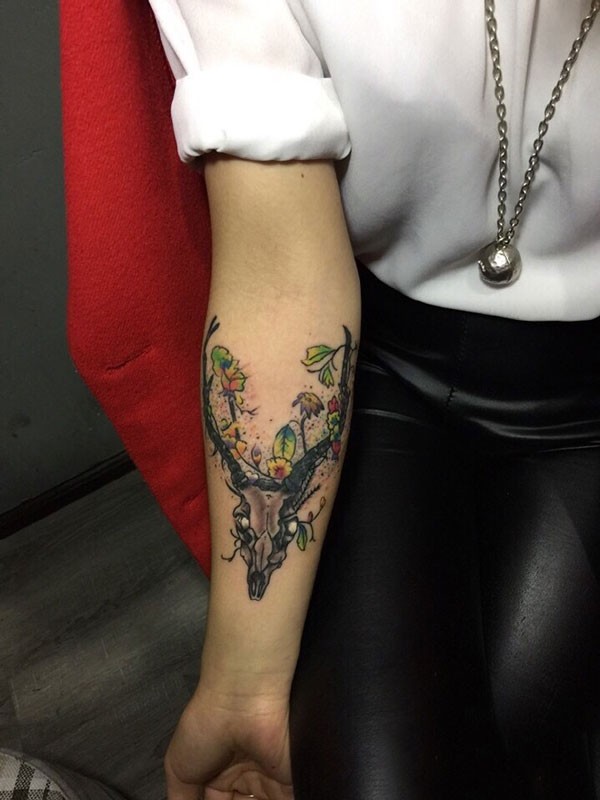 个性的手臂鹿头叶子彩色纹身图案