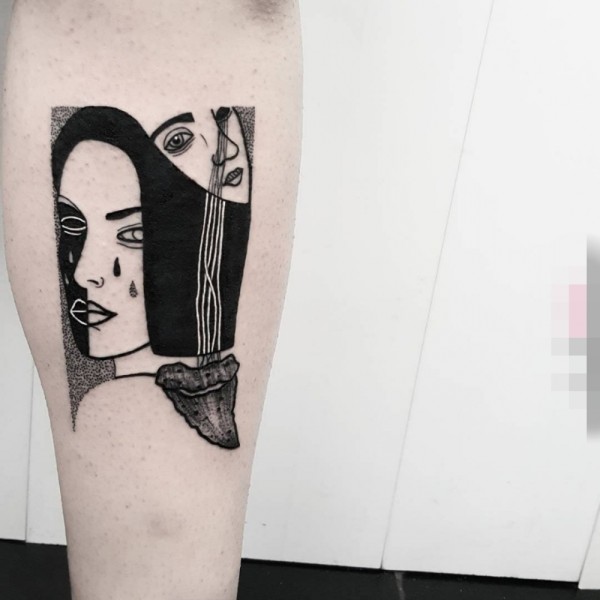 黑白点刺技巧抽象线条人物肖像纹身图案