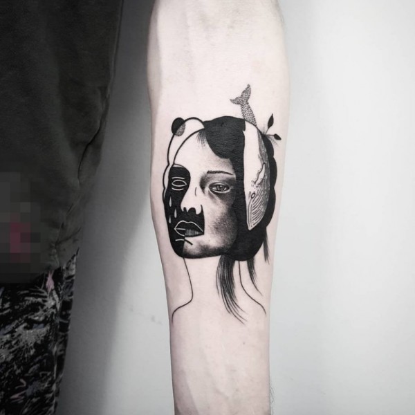 黑白点刺技巧抽象线条人物肖像纹身图案