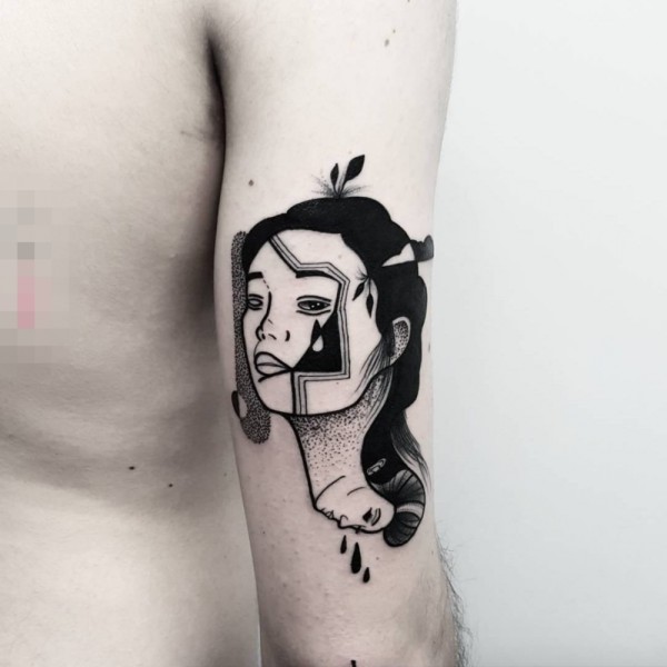黑白点刺技巧抽象线条人物肖像纹身图案