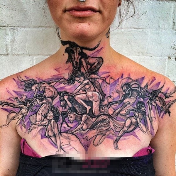 胸部道人加燕子图案半胛纹身