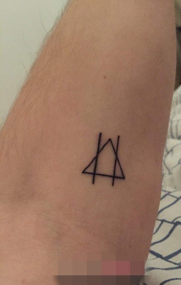 男生手臂上黑白简单线条几何元素三角形纹身图片