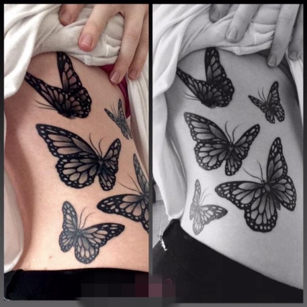 女生侧腰上黑白点刺技巧小动物几何元素蝴蝶纹身图片