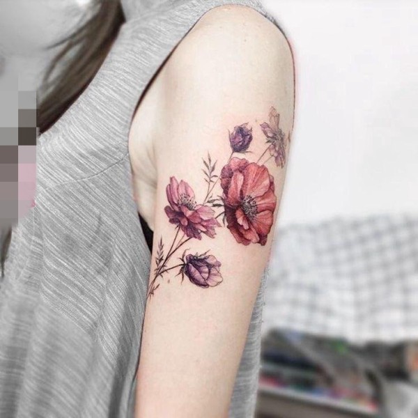 女生手臂上彩色渐变植物简单线条花朵纹身图片