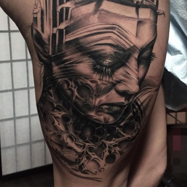 超现实主义黑白点刺技巧人物肖像纹身图案