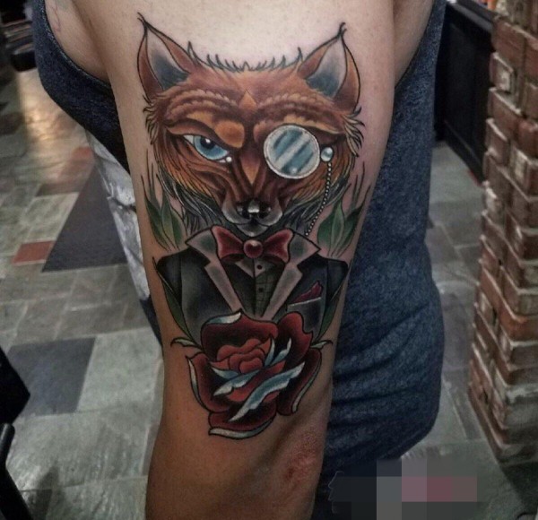 男生手臂上彩绘动物点刺技巧狐狸纹身图片