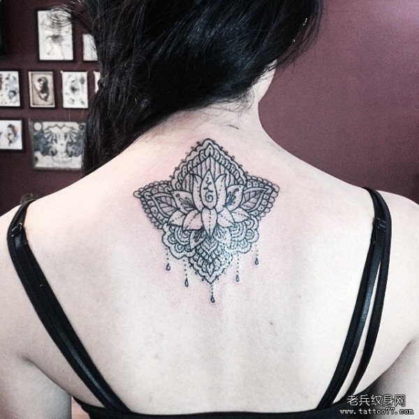 女生背部蕾丝梵花挂饰纹身图案