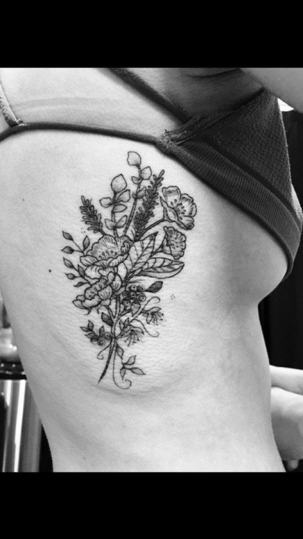 女生侧腰上黑白植物素材简单线条花朵纹身图片