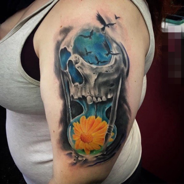 女生手臂上彩绘花朵和点刺技巧骷髅头纹身图片