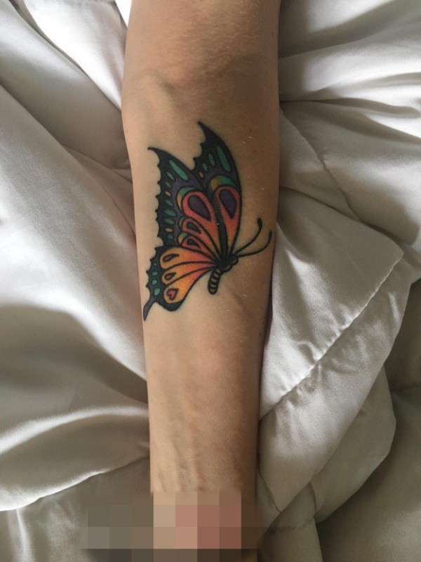 女生手臂上彩色水墨花蝴蝶纹身图片