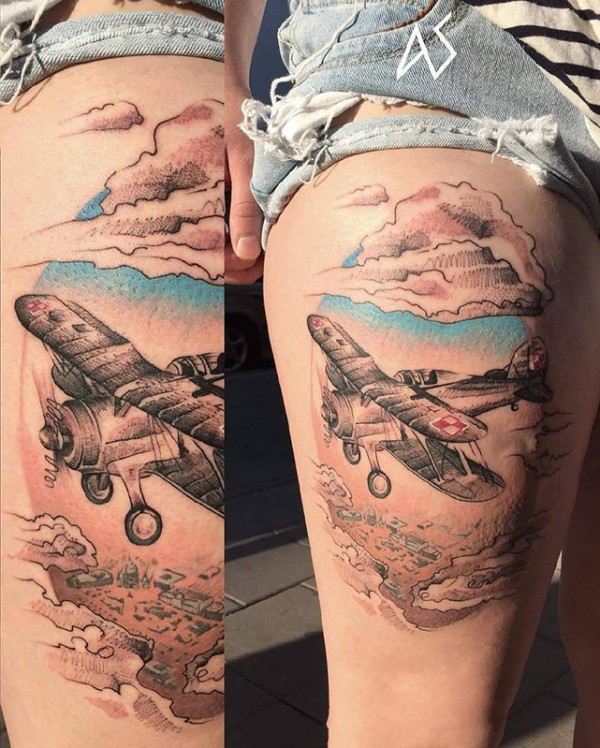 大腿彩绘冲上云霄的飞机创意纹身图案