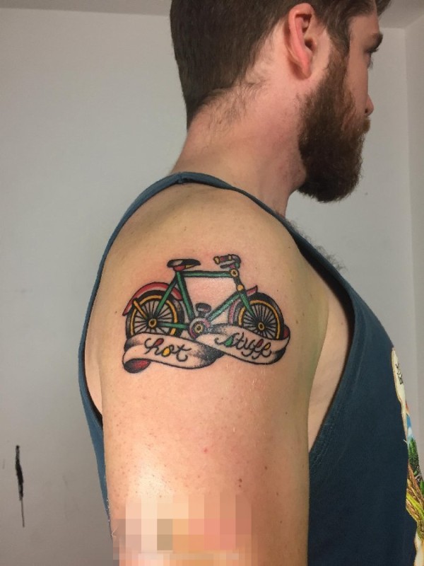 男生肩部彩绘点刺技巧英文单词和自行车纹身图片