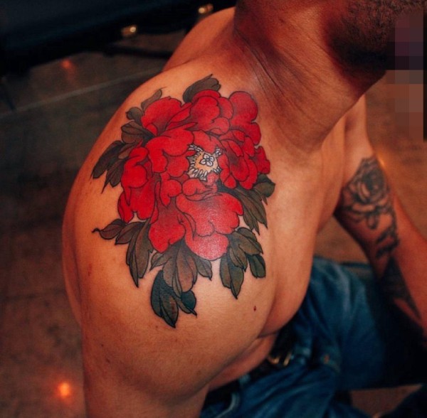 男生肩部彩绘植物素材文艺花朵纹身图片