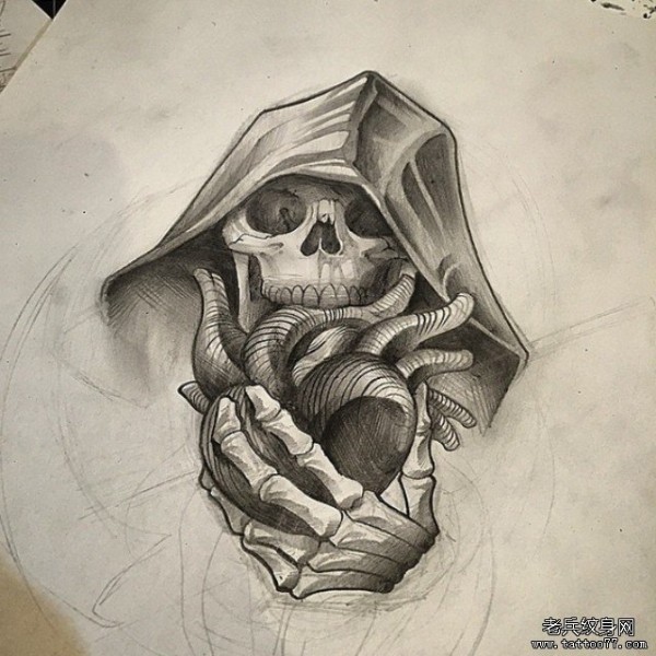 欧美死神心脏黑灰纹身图案手稿