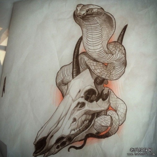 欧美眼镜蛇羊头骷髅纹身图案手稿
