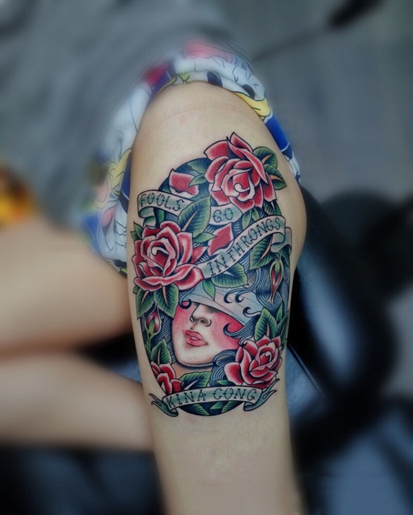 大腿old school玫瑰女郎彩绘纹身图案