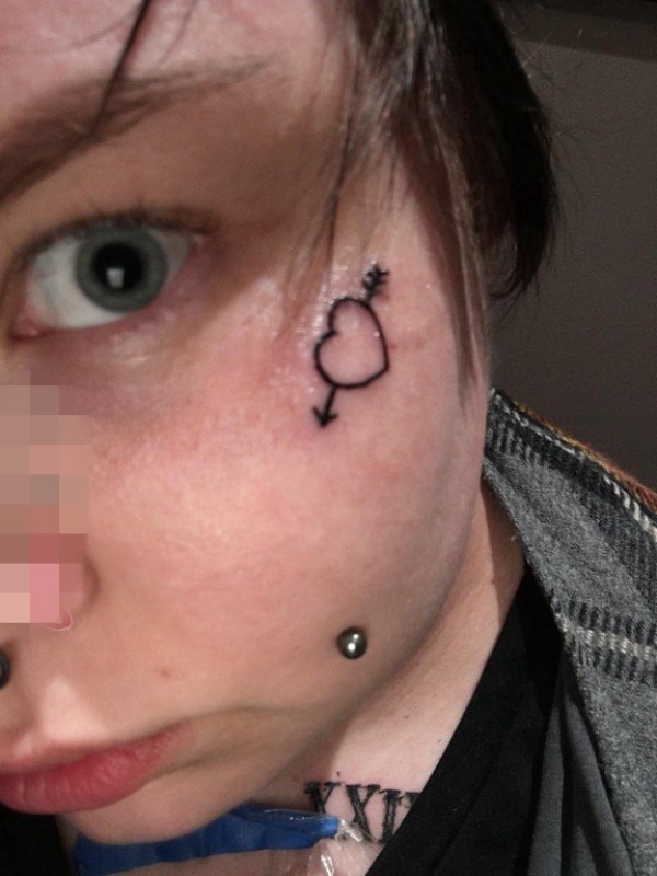 女生脸上黑色简约线条丘比特神箭纹身图片