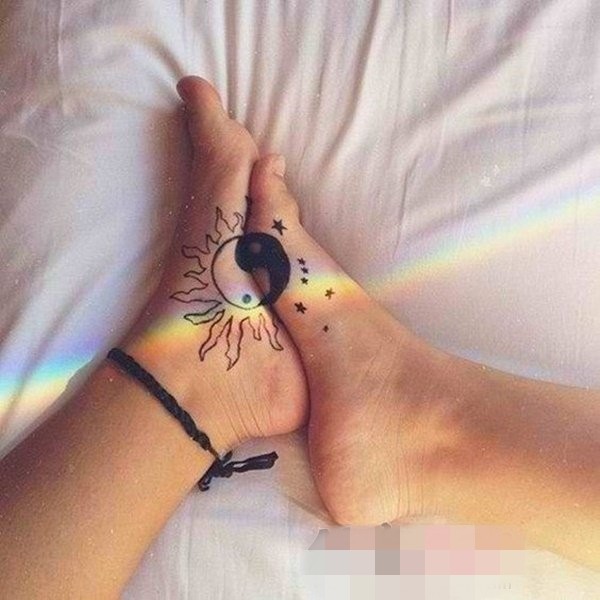 情侣闺蜜脚上黑白阴阳太阳星星纹身图片