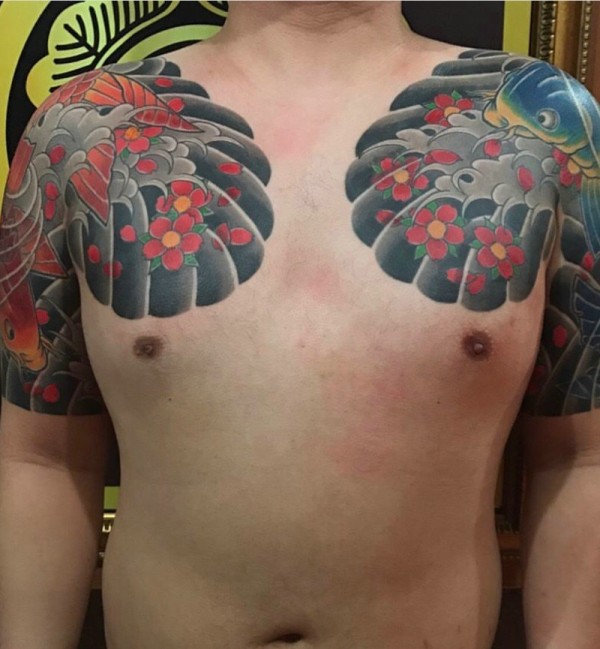 非常霸气的半甲经典彩色鲤鱼花卉纹身图案