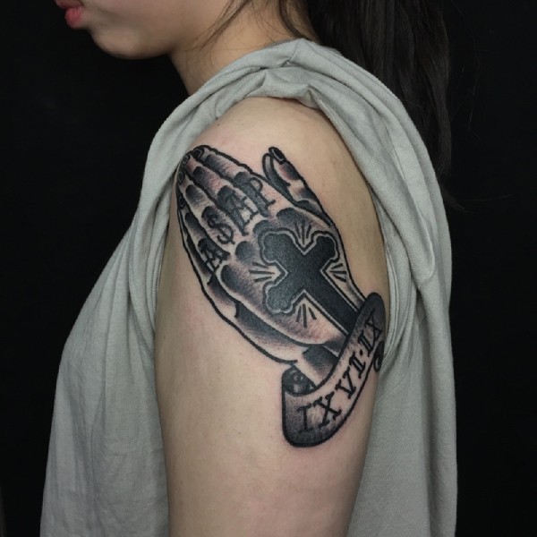 手臂祈祷的手与十字架纹身图案