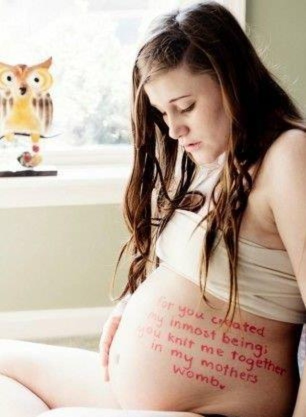 一张独特时髦的孕妇腹部英文字母纹身图案