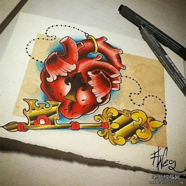 欧美school心脏锁和钥匙纹身图案手稿