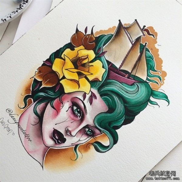 欧美school女郎玫瑰花帆船纹身图案手稿