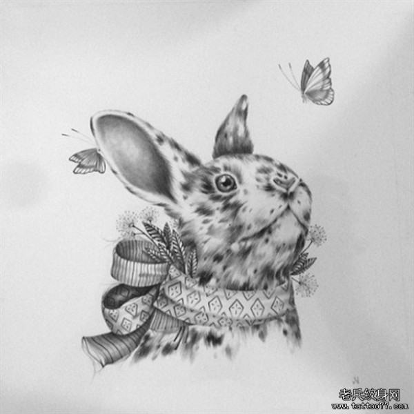 欧美兔子蝴蝶结黑灰纹身图案手稿