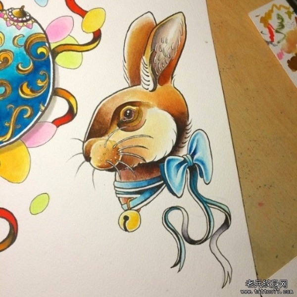 欧美兔子蝴蝶结彩色纹身图案手稿