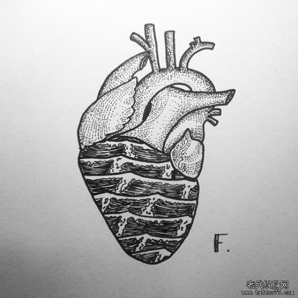 点刺心脏海浪欧美纹身图案手稿