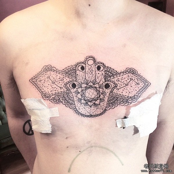 胸部法蒂玛之手和梵花线条点刺纹身图案