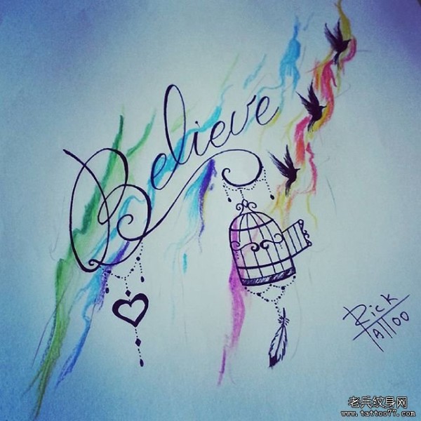 欧美英文字母心形鸟笼泼墨纹身图案手稿