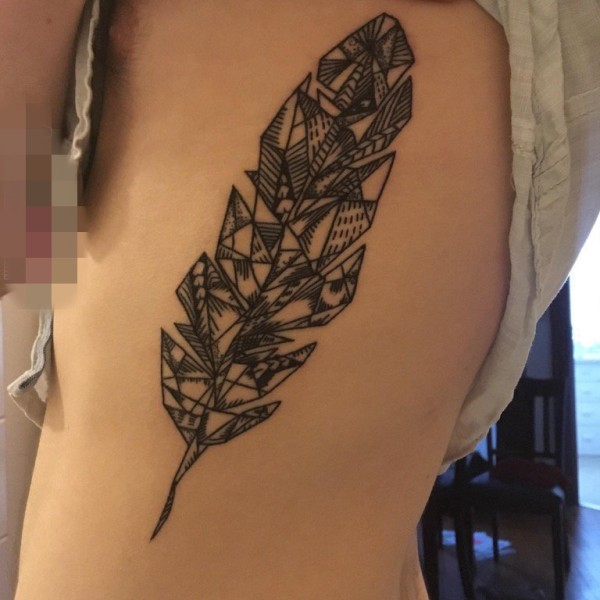 女生侧腰上黑色几何元素抽象线条羽毛纹身图片