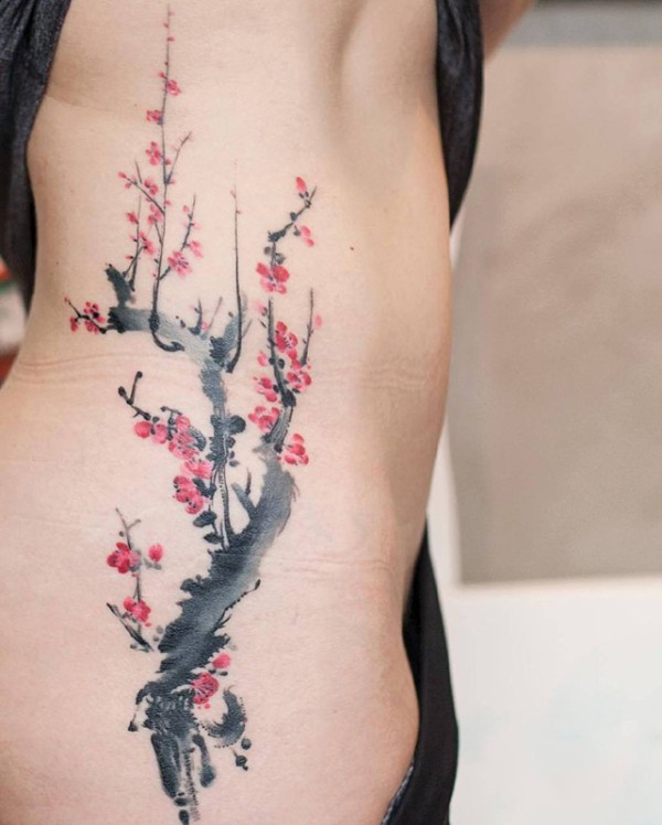刺骨寒风送梅香,腰部水墨风格梅花纹身