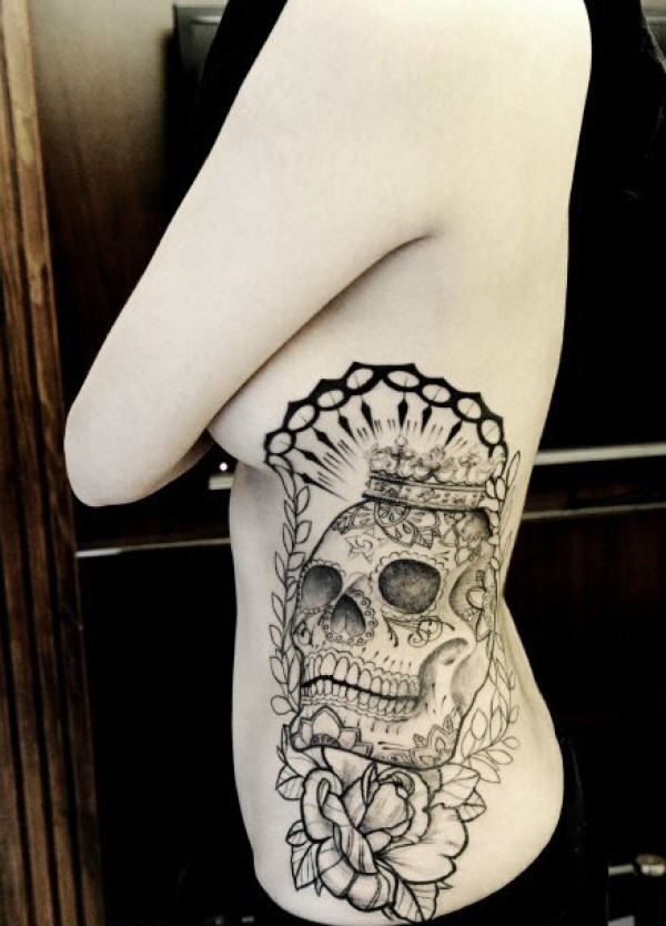 侧肋黑色炫酷的骷髅玫瑰皇冠纹身图案